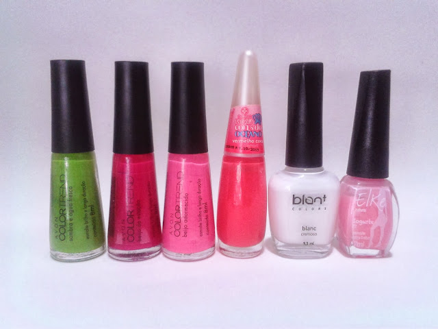 Esmaltei primeiro as unhas que escolhi fazer a arte com o Iogurte e as demais com o Vermelho Coral. Depois fiz as flores com já expliquei (aqui) com o Beijo da Estação, Beijo Adormecido, Blanc e as folhinhas com o Sombra e Água Fresca.